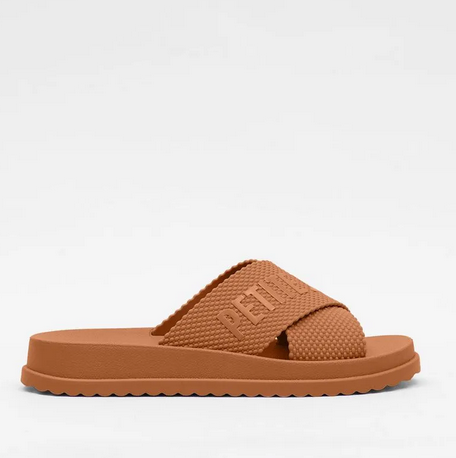 Chinelo J-Soft na cor Doce de Leite. Com design moderno e confortável, possui duas tiras largas cruzadas sobre o pé e aplicação do logo da marca em destaque. O solado é flatform, levemente tratorado, com shape anatômico que deixa os dedos e o calcanhar à mostra.